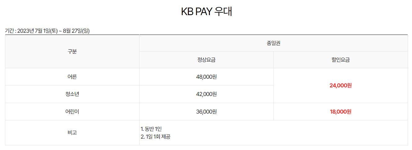 다음으로 저렴한 행사는 23년 8월 27일까지 진행되는 KB PAY 우대 혜택입니다. 매달 프로모션에 의해 진행되는 카드사나 혜택이 달라질 수 있기 때문에 카드사 할인의 경우 주의해야 합니다. KB PAY 우대 할인 혜택은 모바일과 현장 결제 모두 가능합니다.