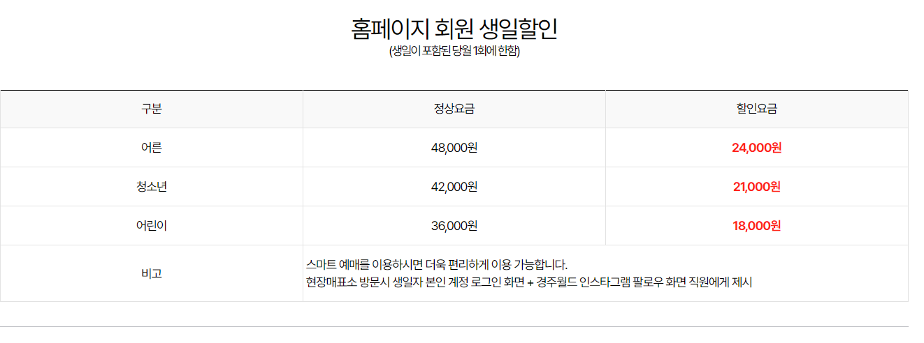 1. 경주월드 자유이용권 할인 _ 홈페이지 회원 생일 할인
