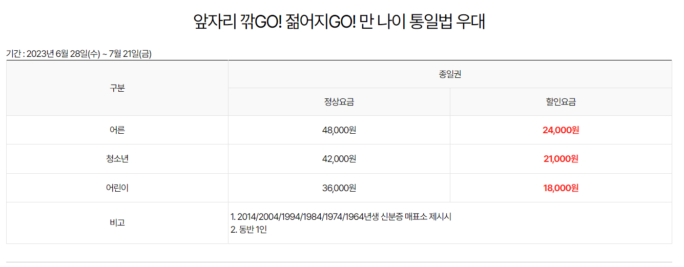 사이트에서 한시적으로 운영하는 이벤트로 6월부터 변경된 만 나이 시행으로 진행 중인 할인행사입니다. 7월 21일(금)까지 진행되며 2014, 2004,1994 ,1984, 1974, 1694 년생 신분증 매표소 제시시 할인이 진행되며, 동반 1인까지 할인혜택 가능합니다.