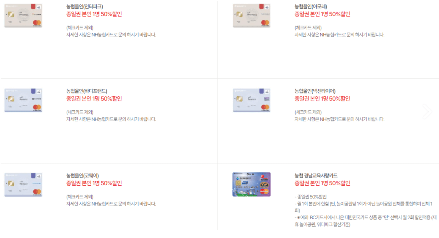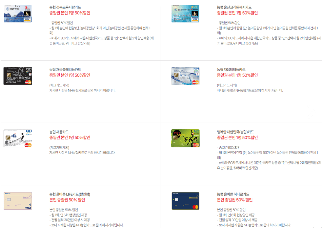 NH농협카드의 경우 경주월드 자유이용권 할인혜택을 가진 카드종류가 가장 많습니다. 다만, 체크카드의 경우 할인 혜택에서 제외되는 점 참고 바랍니다.