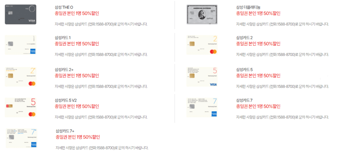 삼성카드는 The O, 더플래티늄, 삼성카드의 숫자 시리즈 카드사에 한하여 자유이용권 할인혜택을 제공합니다.