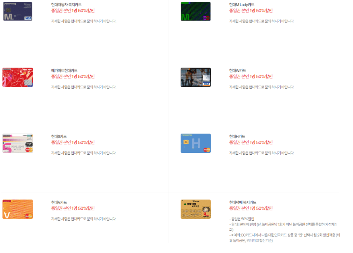 현대카드는 현대 H, W, V , S , 현대 M레이디카드 등이 50% 할인에 해당합니다.