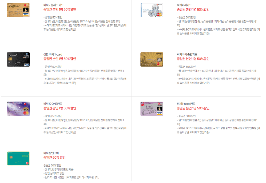 성인의 경우에 가장 유용하게 활용할 수 있는 부분입니다. 신용카드 할인에 해당하는 카드사는 총 5곳으로 롯데, 현대, NH농협, 삼성, 비씨카드입니다.