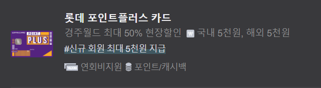 롯데카드 중 경주월드 50% 현장 할인이 가능한 대표적인 카드는 롯데 포인트 플러스 카드입니다. 롯데 포인트 플러스 카드는 이전 결제실적과 관계없이 할인이 가능합니다. 국내 5천 원 해외 5천 원의 저렴한 연회비로 가입이 가능합니다.