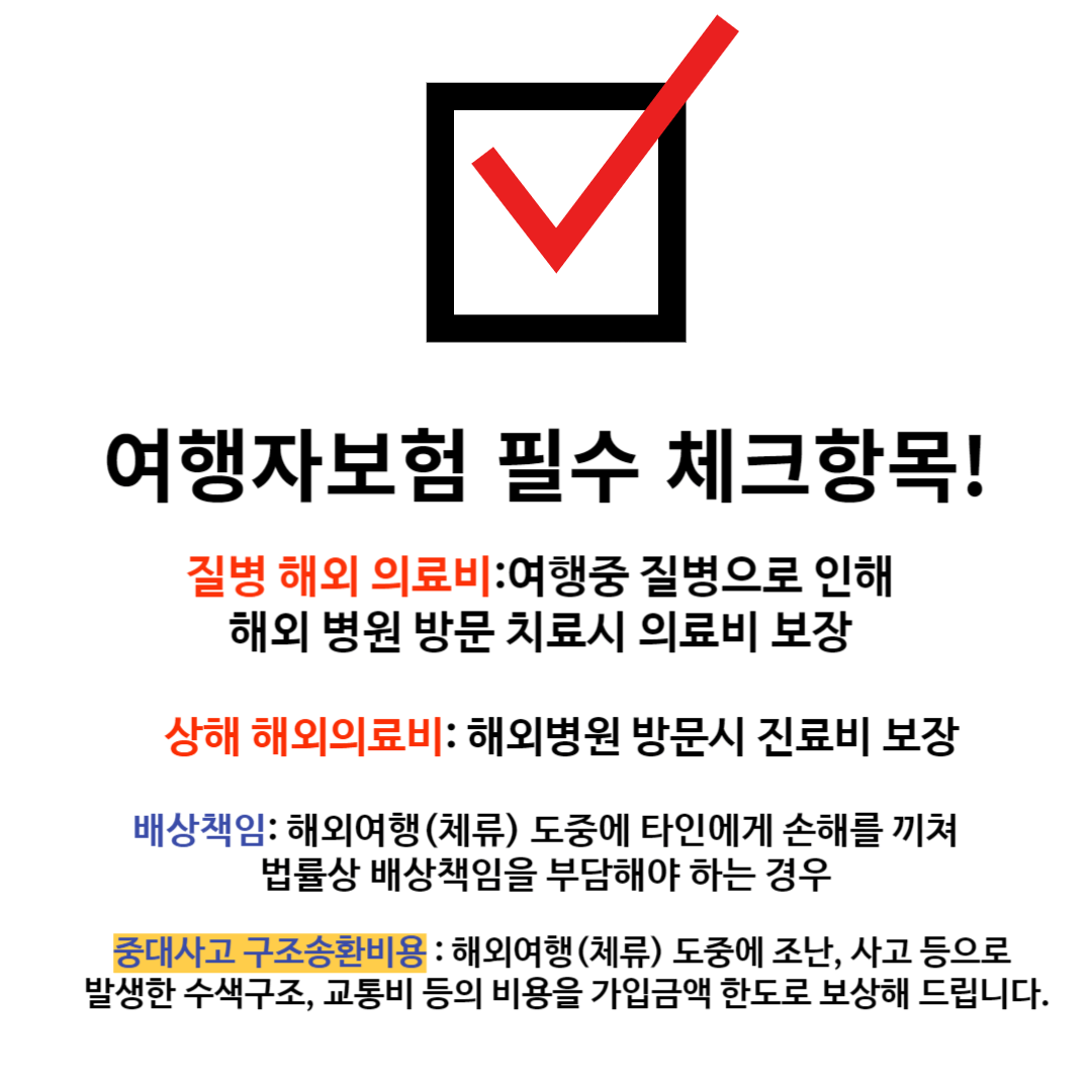 (8) 여행자보험 : 단체 여행자보험의 경우, 부족한 부분이 있을 수 있습니다. 여행사에 위의 항목에 대한 부분이 포함되어 있는지 문의해 보세요. 포함되어 있지 않다면 만일을 대비하는 것을 권장드립니다.