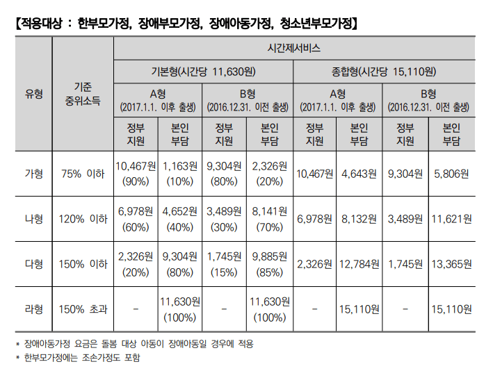 ●1세 이하 아이를 양육하는 24세 이하 청소년 부모, 한부모 가족의 경우 이용요금의 90% 지원 (가, 나, 다형 안에 포함되어야 함)
