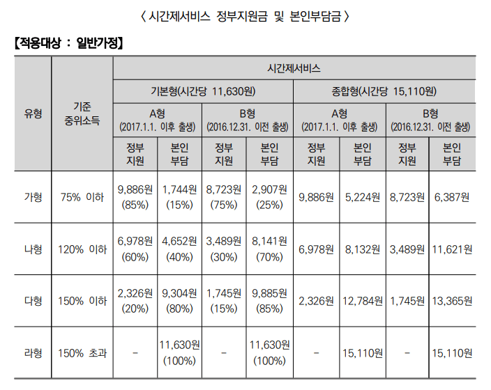 중위 가구 소득기준에 따라 차등 지원이며, 본인부담 100%로 이용도 가능하니 참고해 주세요.